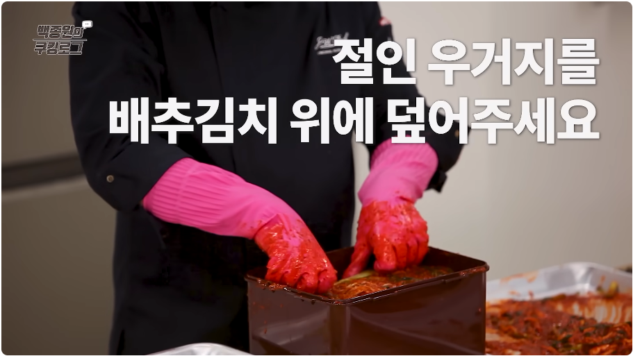 - 김치통이 채워지면 남은 절인 배추 이파리로 김치를 덮어 보관한다.